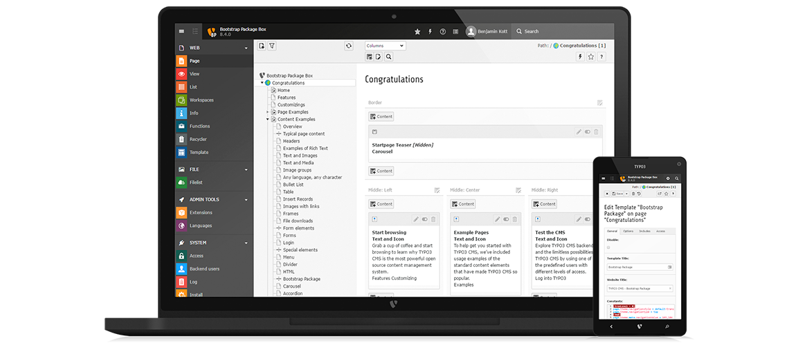 The administration interface, called TYPO3 Backend, can be managed from any modern web browser, including tablets and smart phones the same way. Publishing a small change on-the-go or working with tablet devices to add content has never been easier.